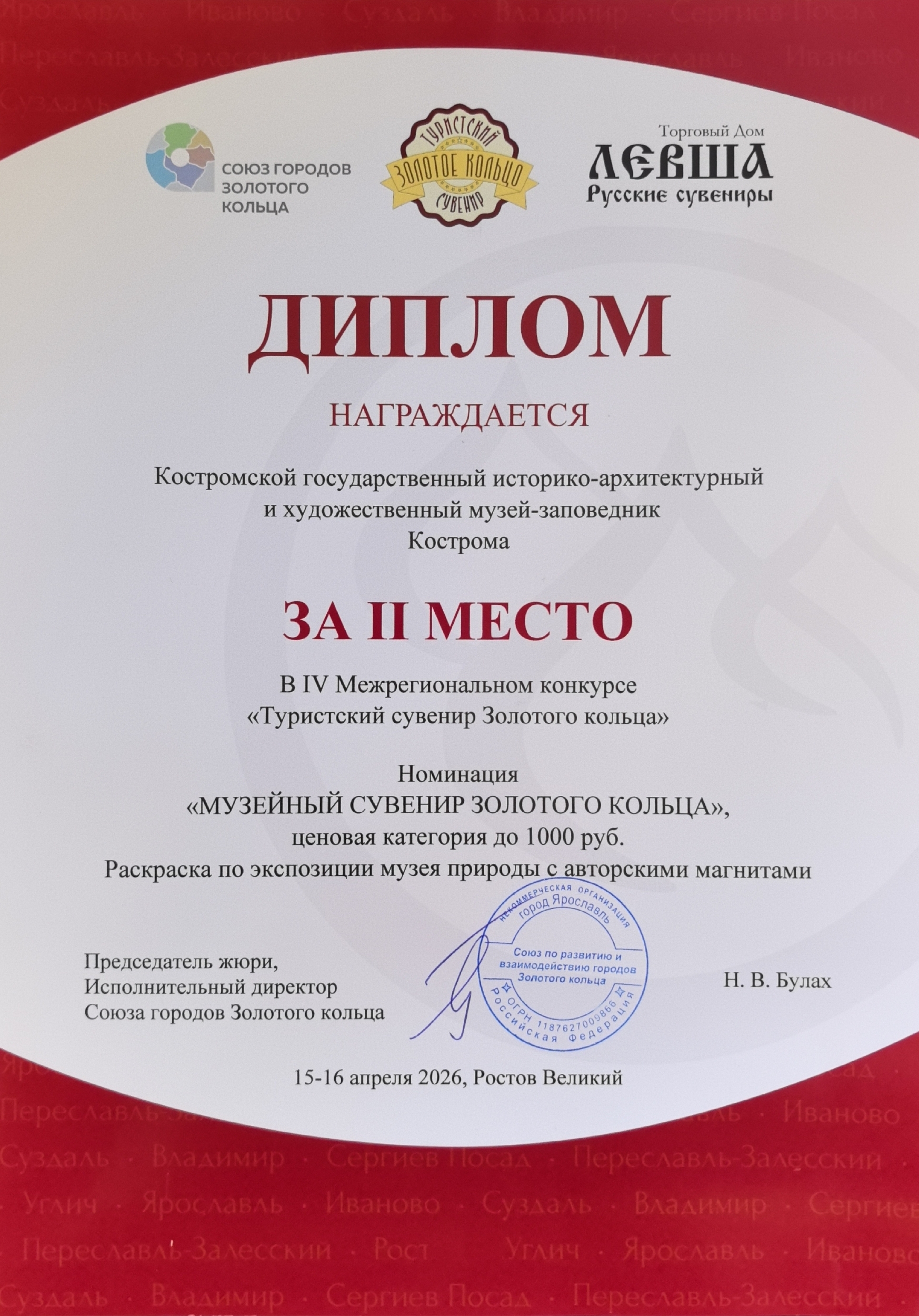 В Ростове Великом прошёл IV Межрегиональный конкурс «Туристский сувенир Золотого кольца». Костромской музей-заповедник не только достойно представил регион, но и завоевал полный комплект наград — сразу три места в разных ценовых категориях номинации «Музейный сувенир».