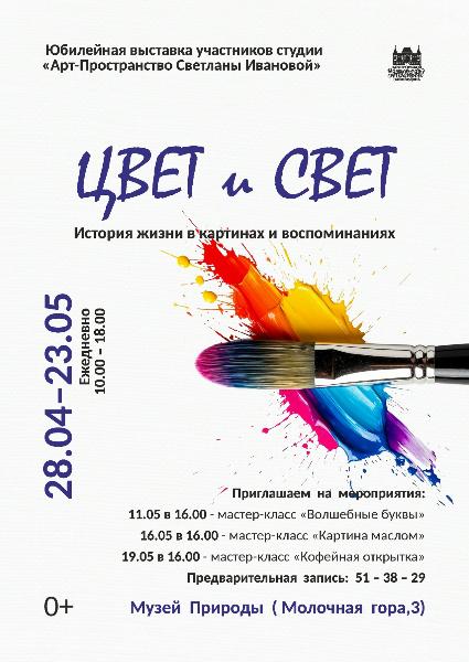 «Цвет и свет» — выставка произведений мастеров из объединения «Арт-пространство». Представлено более 100 работ. Их авторы не профессиональные художники, а люди, для которых рисование — хобби. Выставка демонстрирует разнообразие подходов: здесь можно увидеть картины, созданные одним автором, а также полотна, написанные целыми семьями.