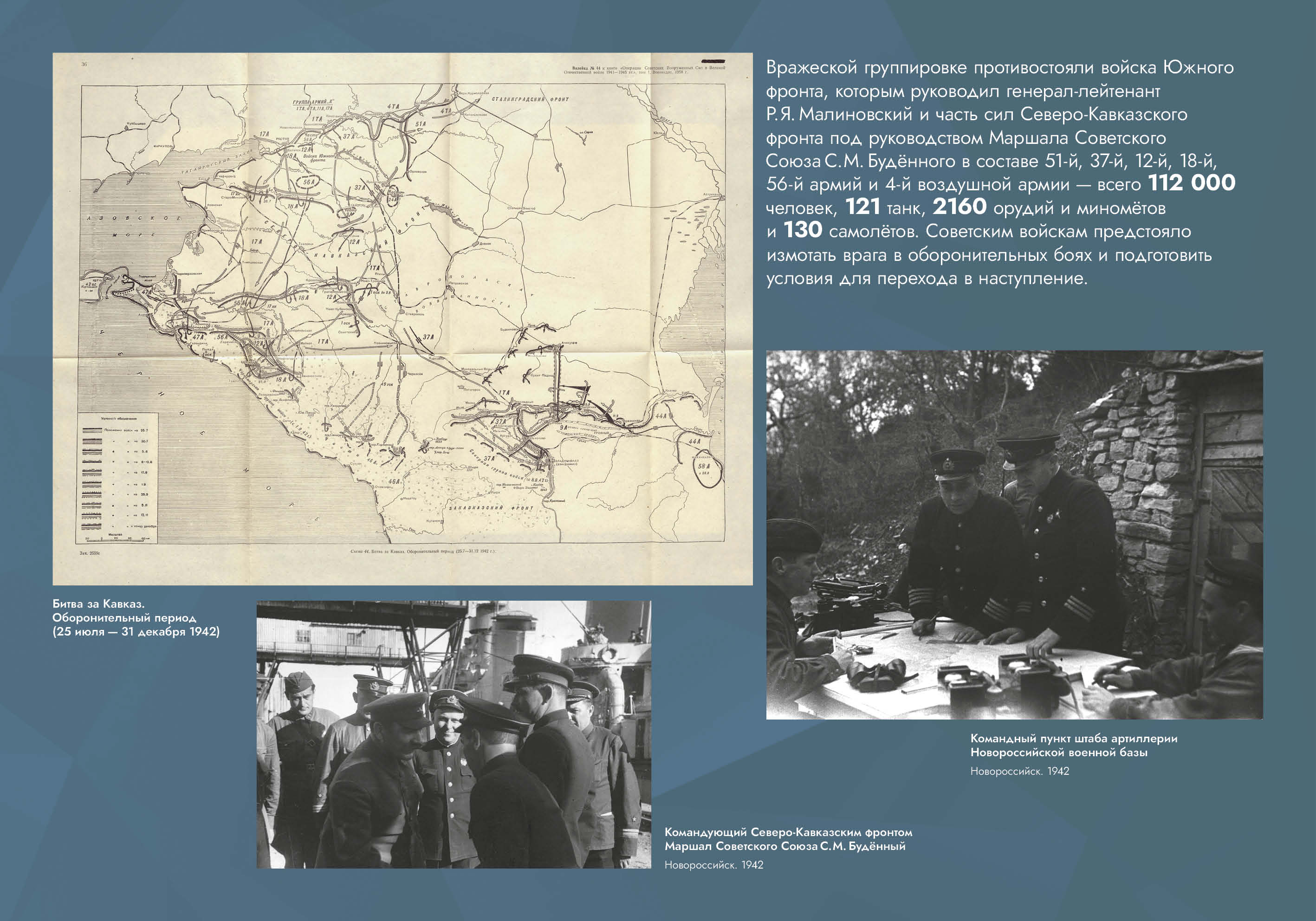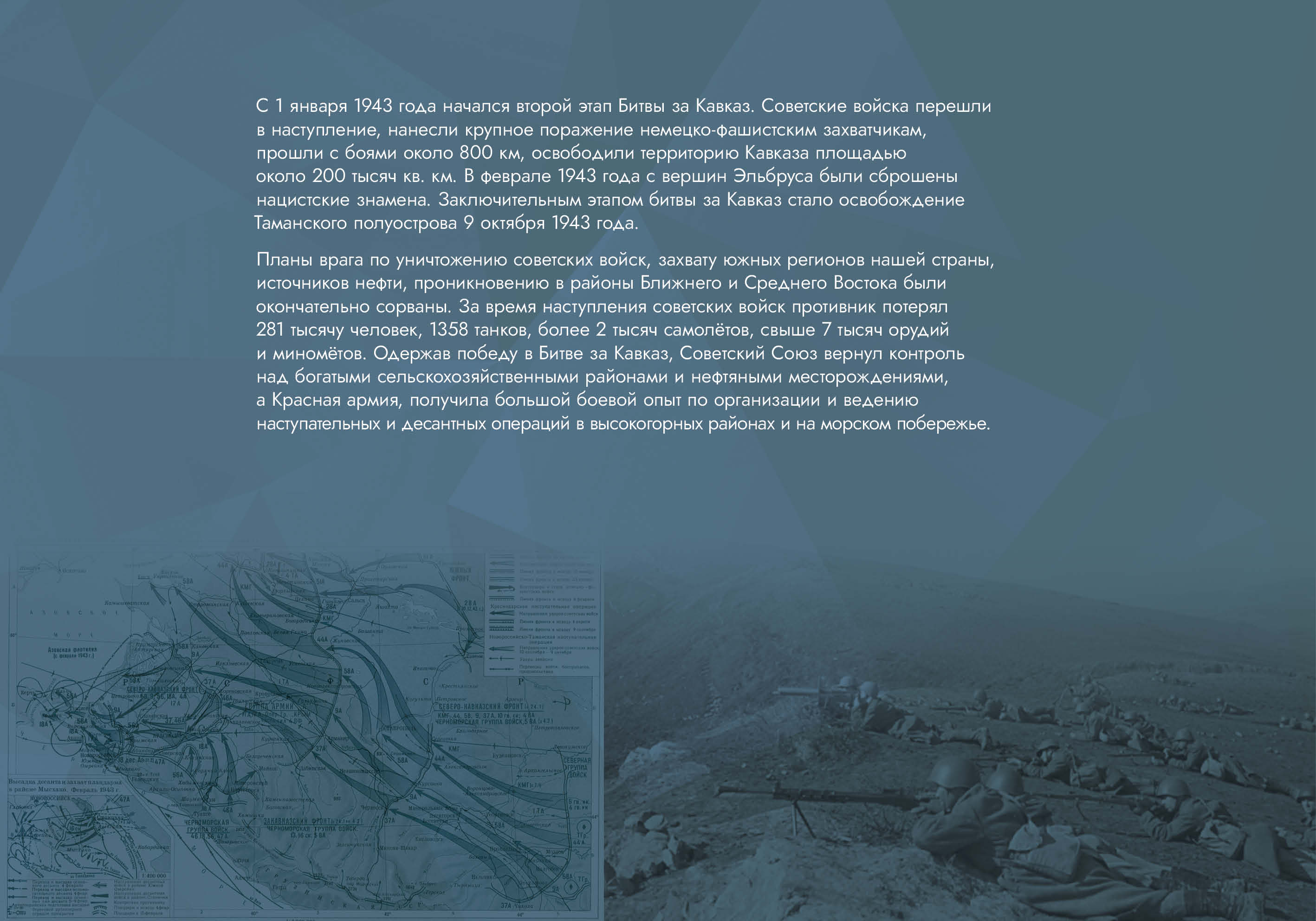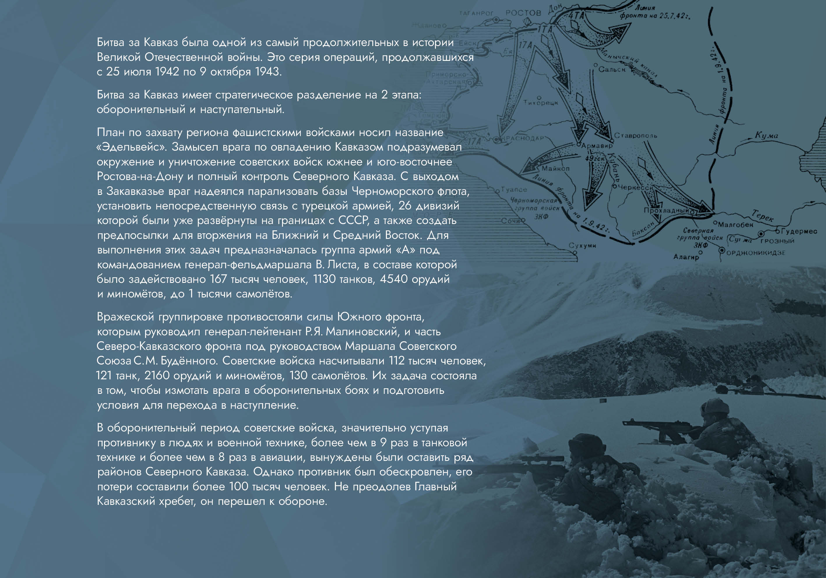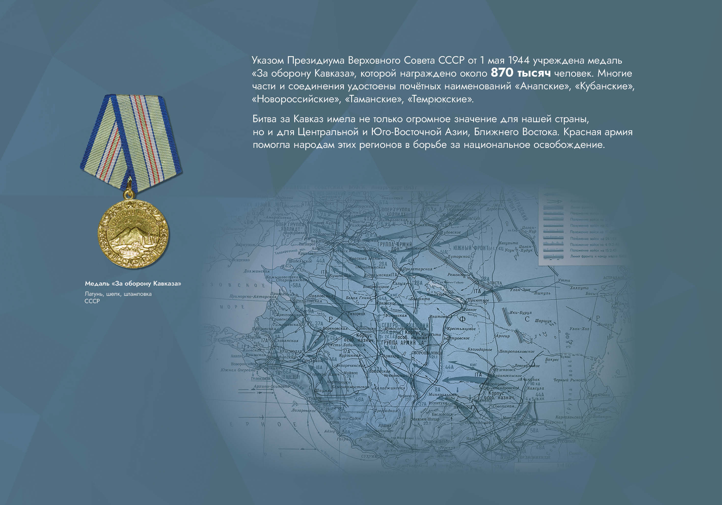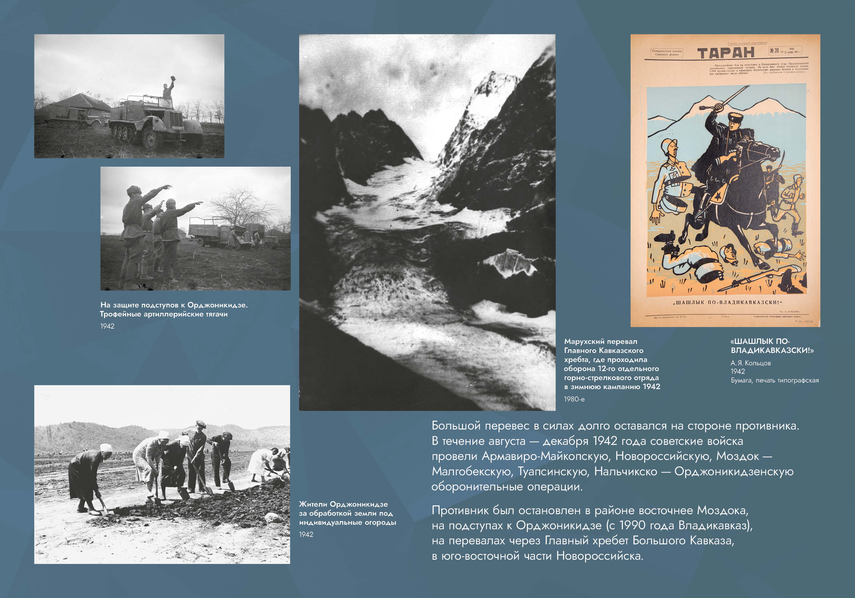 Выставка рассказывает об оборонительных и наступательных операциях, проведённых советскими войсками с целью обороны Кавказа и разгрома вторгшихся в его пределы немецко-фашистских войск.