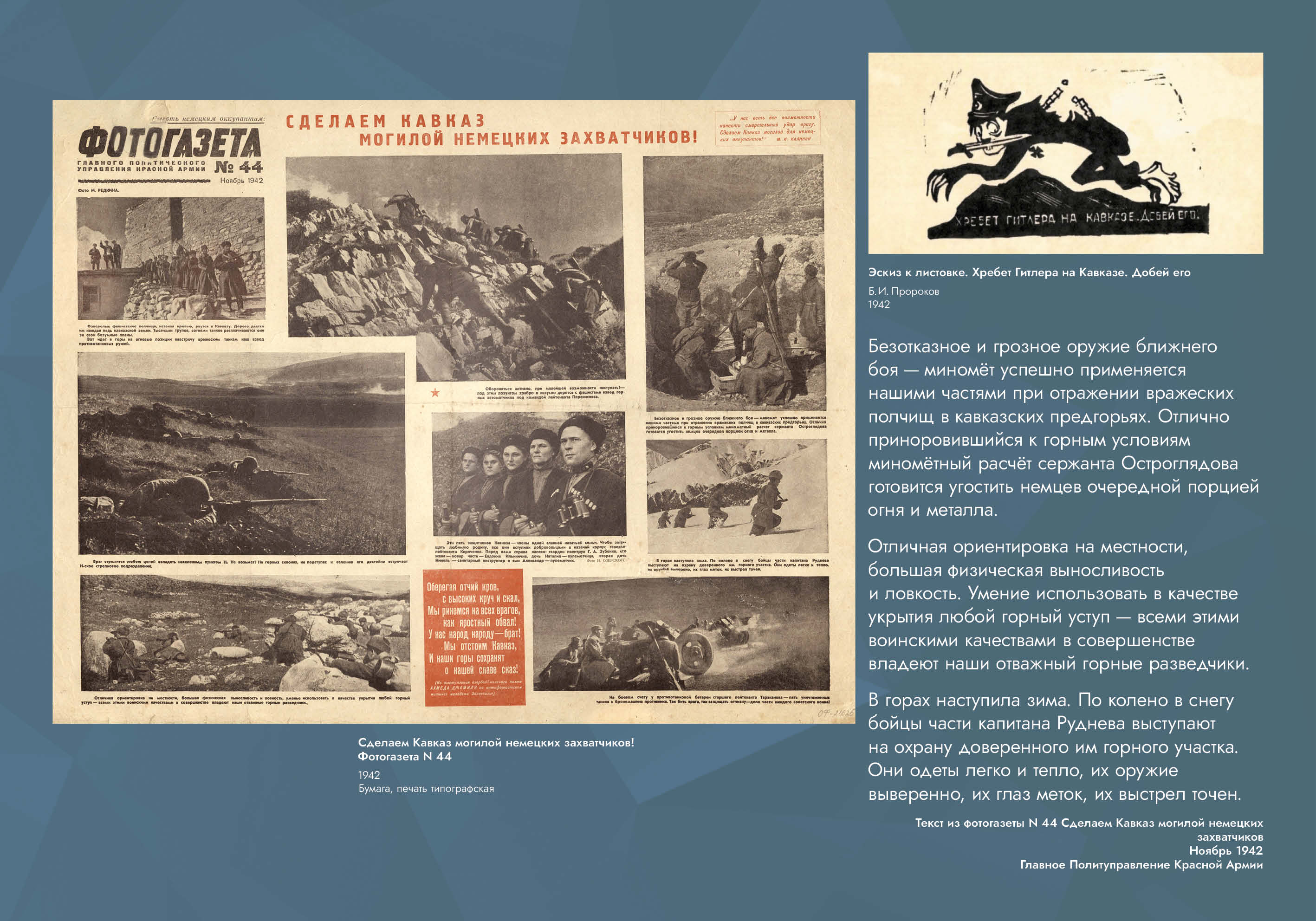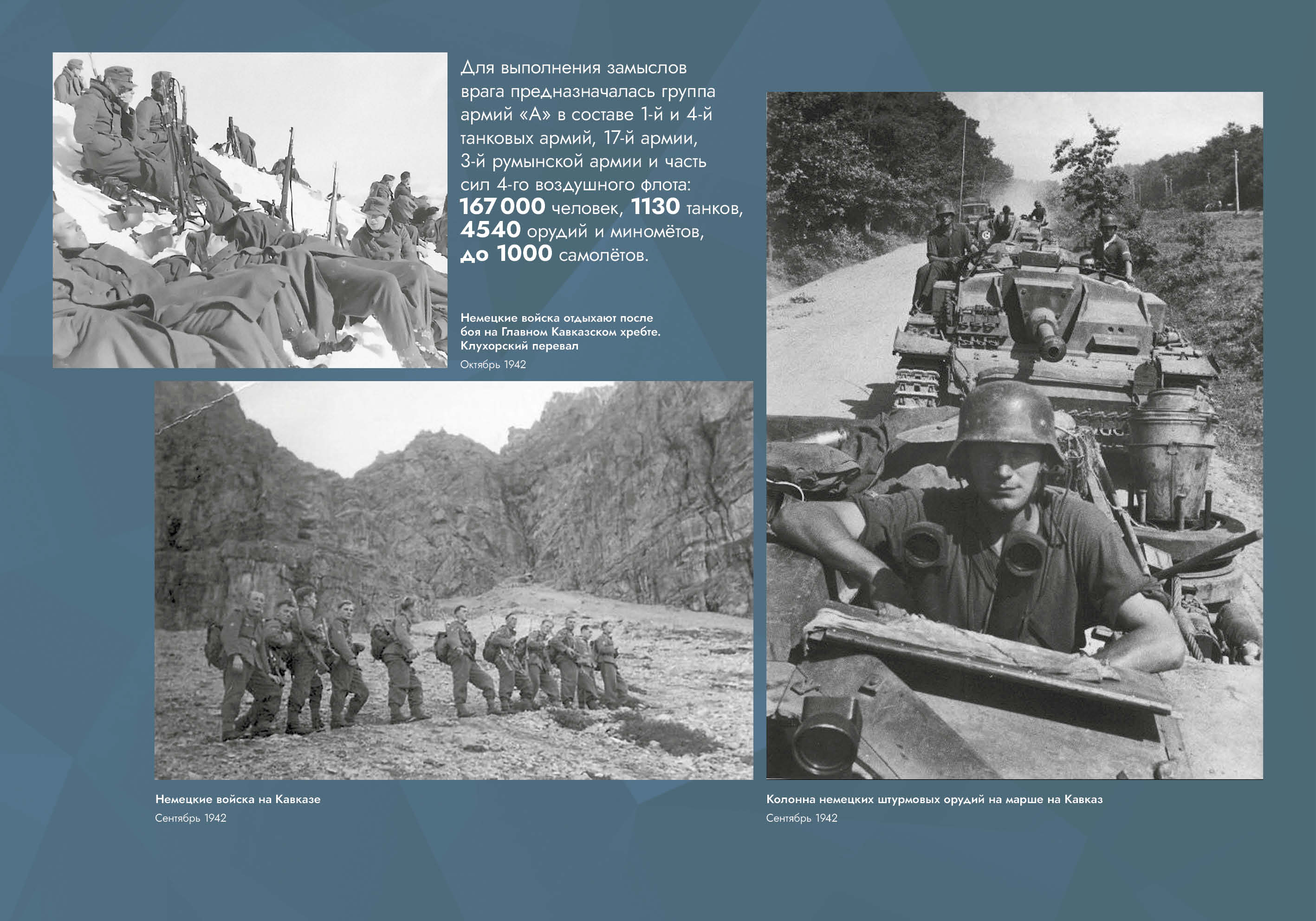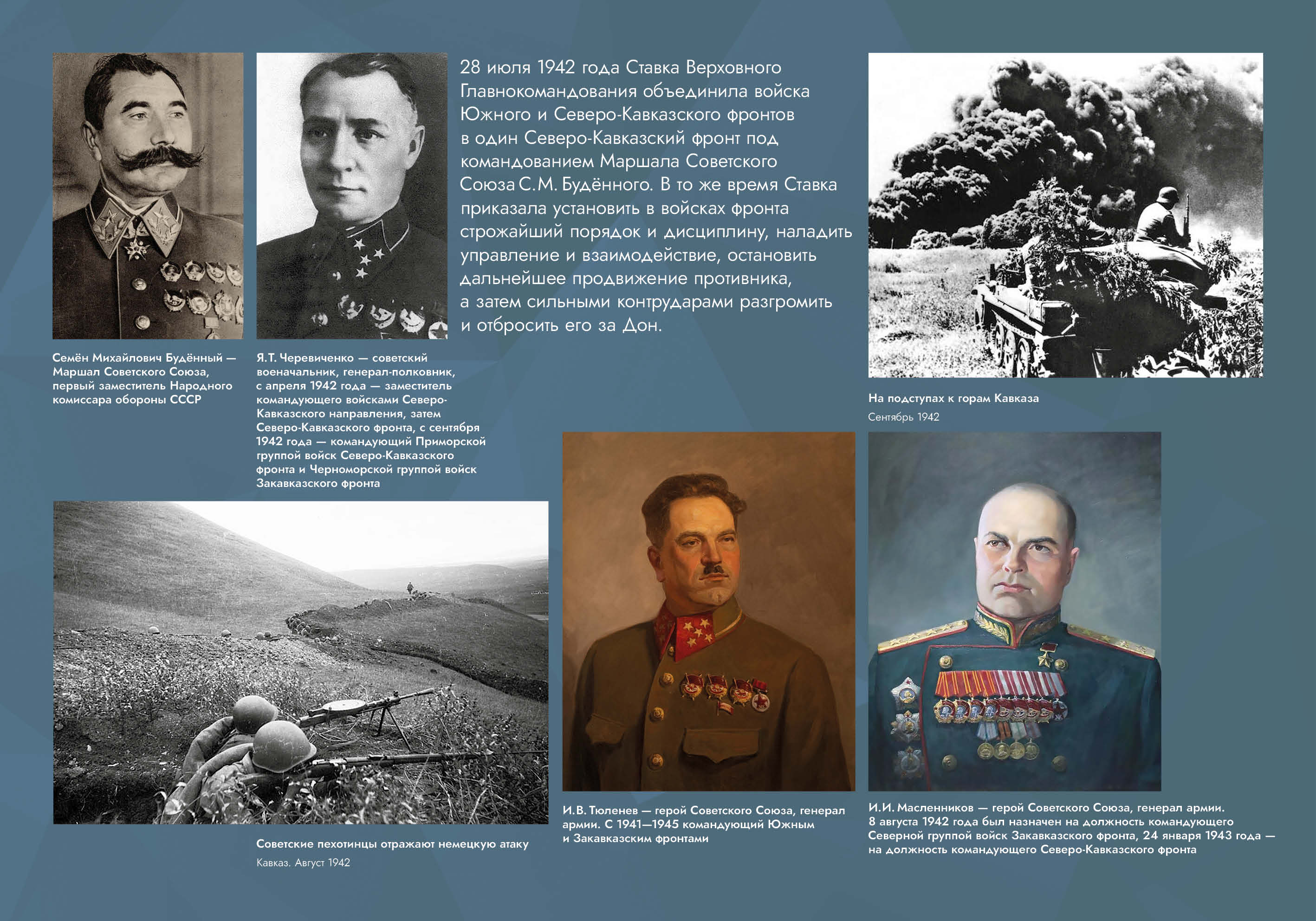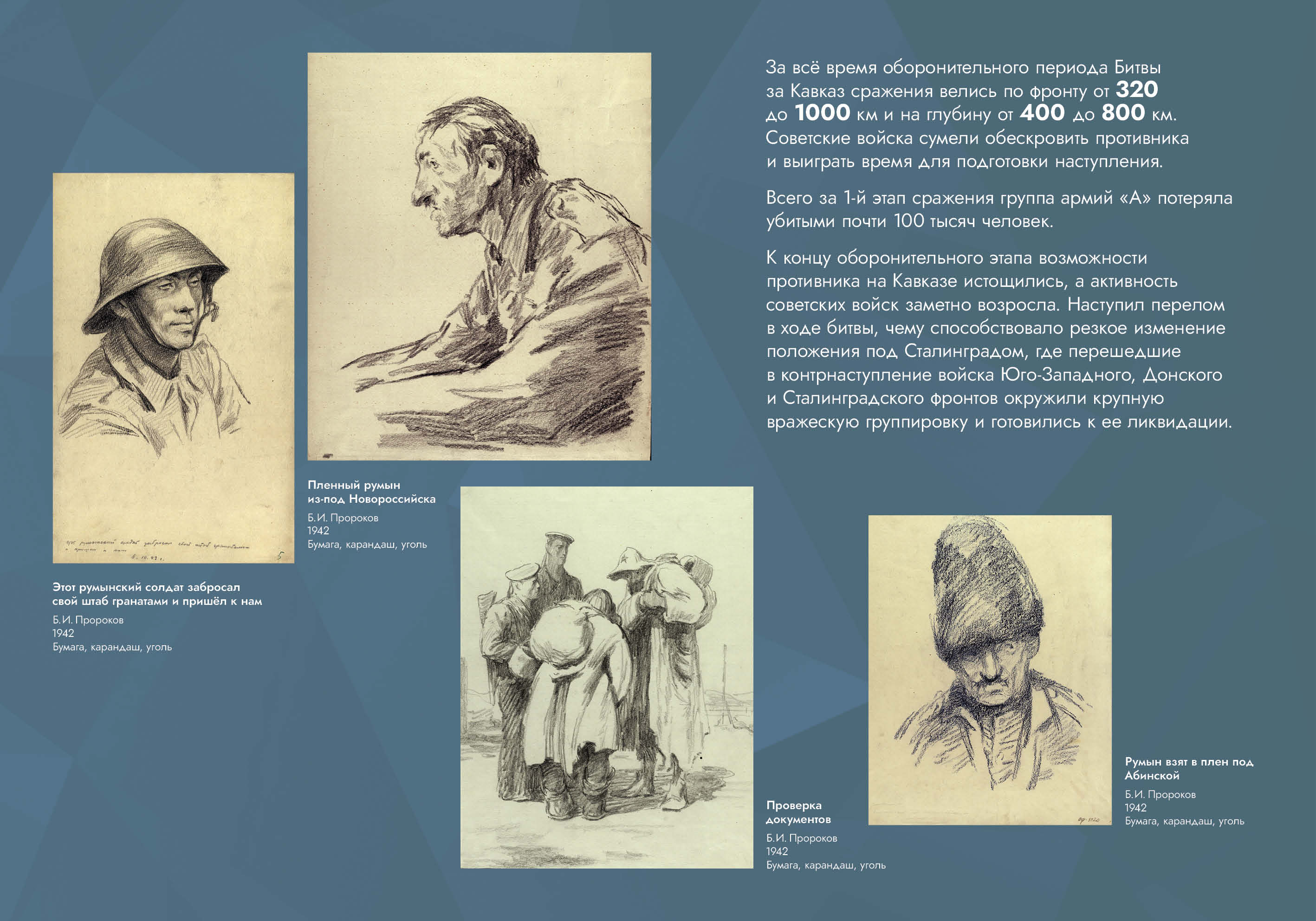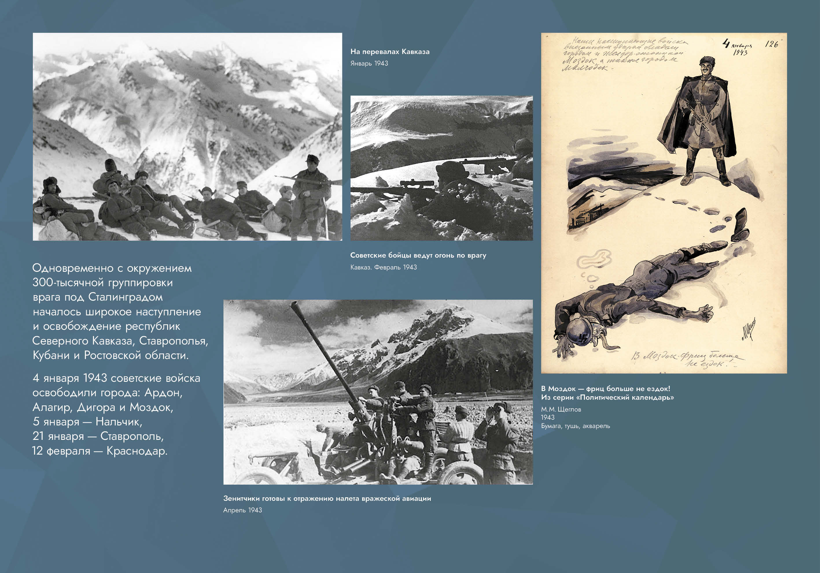 Выставка рассказывает об оборонительных и наступательных операциях, проведённых советскими войсками с целью обороны Кавказа и разгрома вторгшихся в его пределы немецко-фашистских войск.