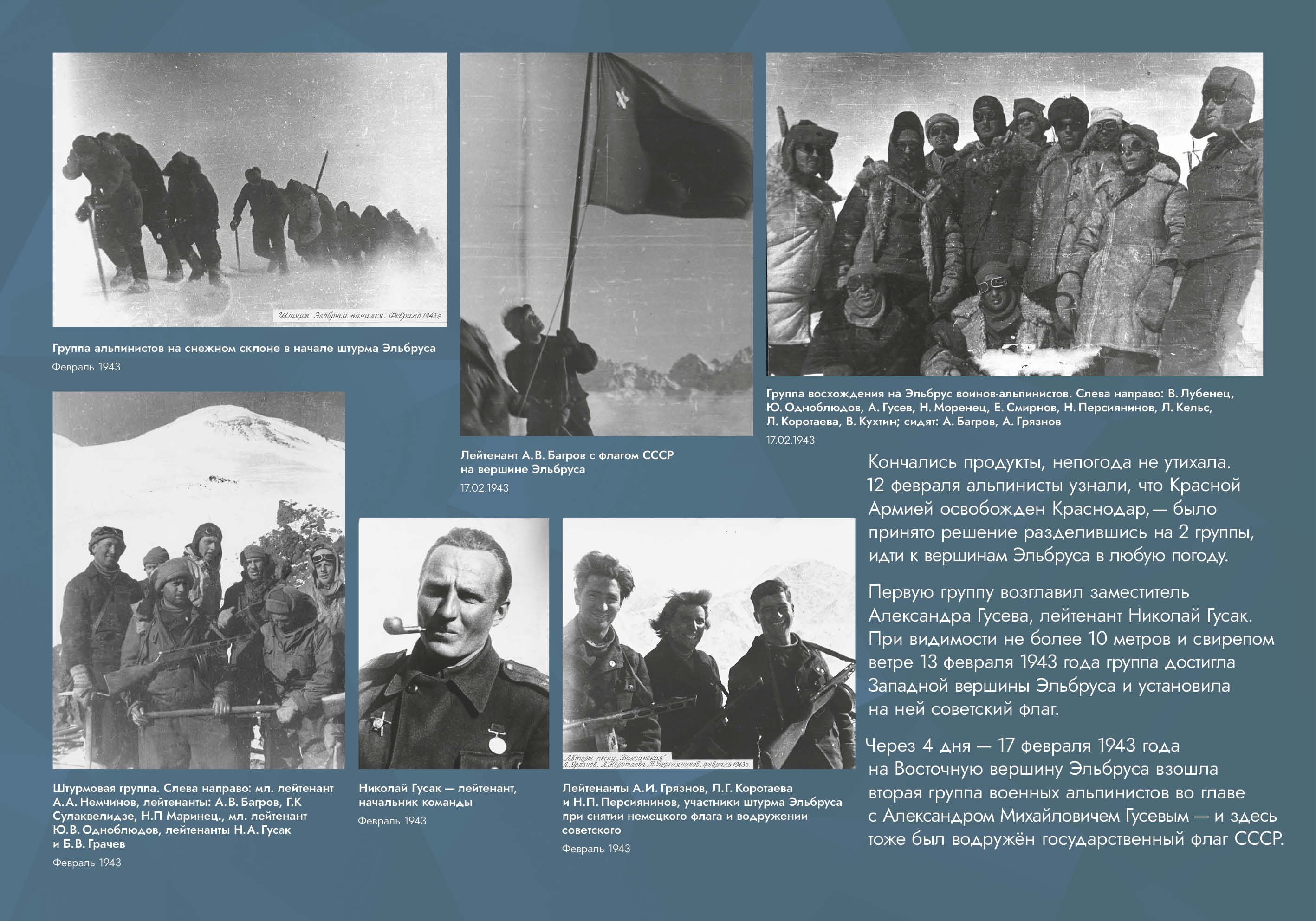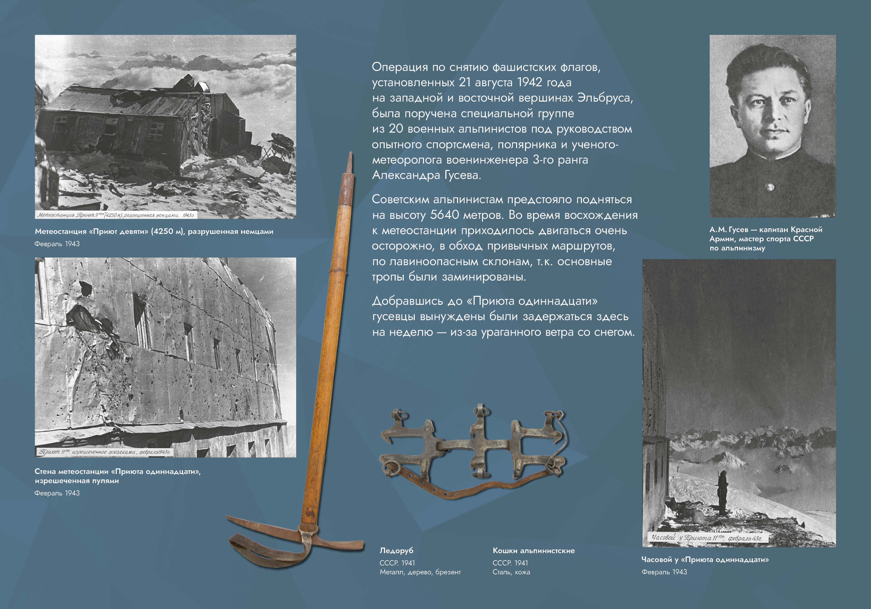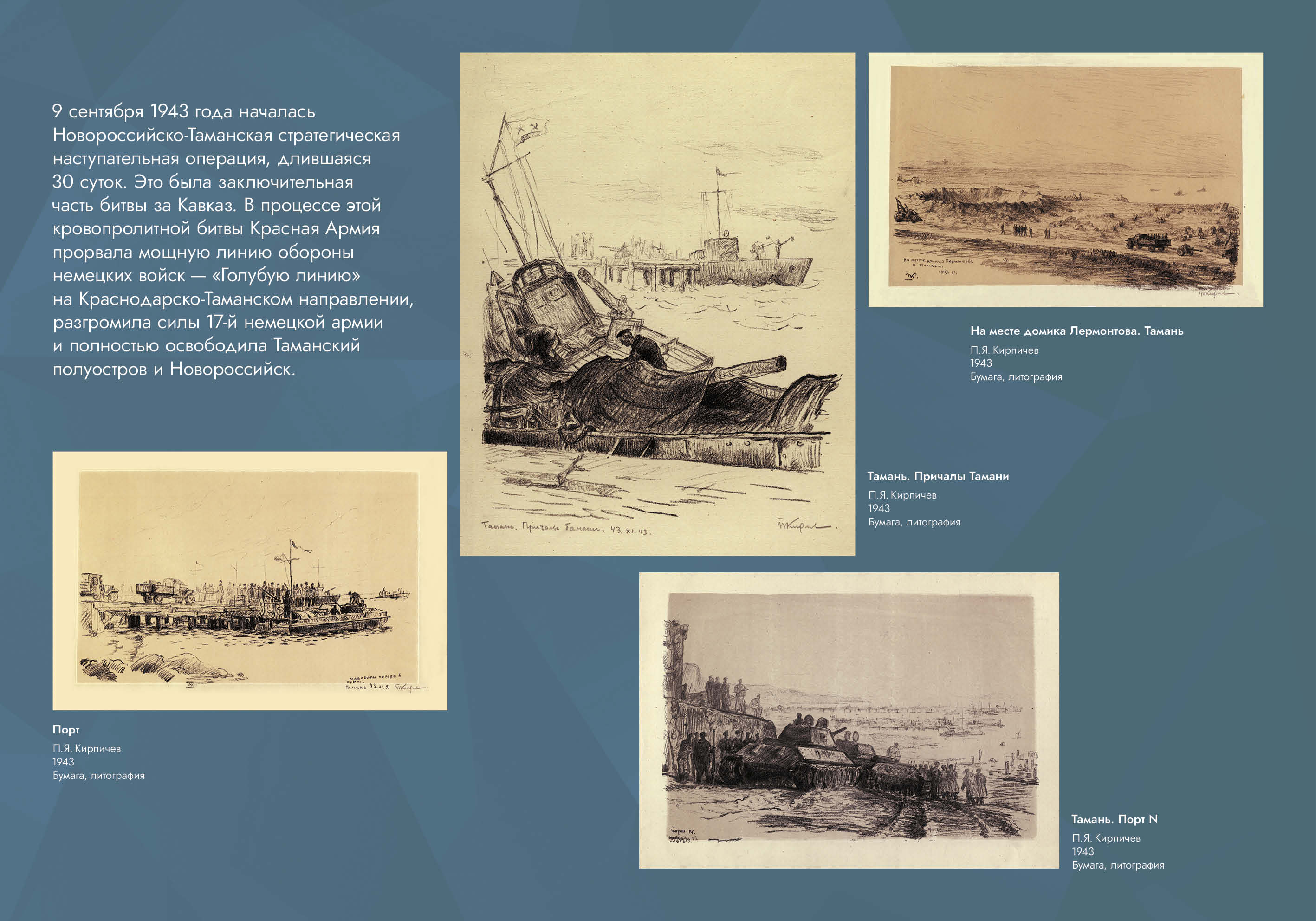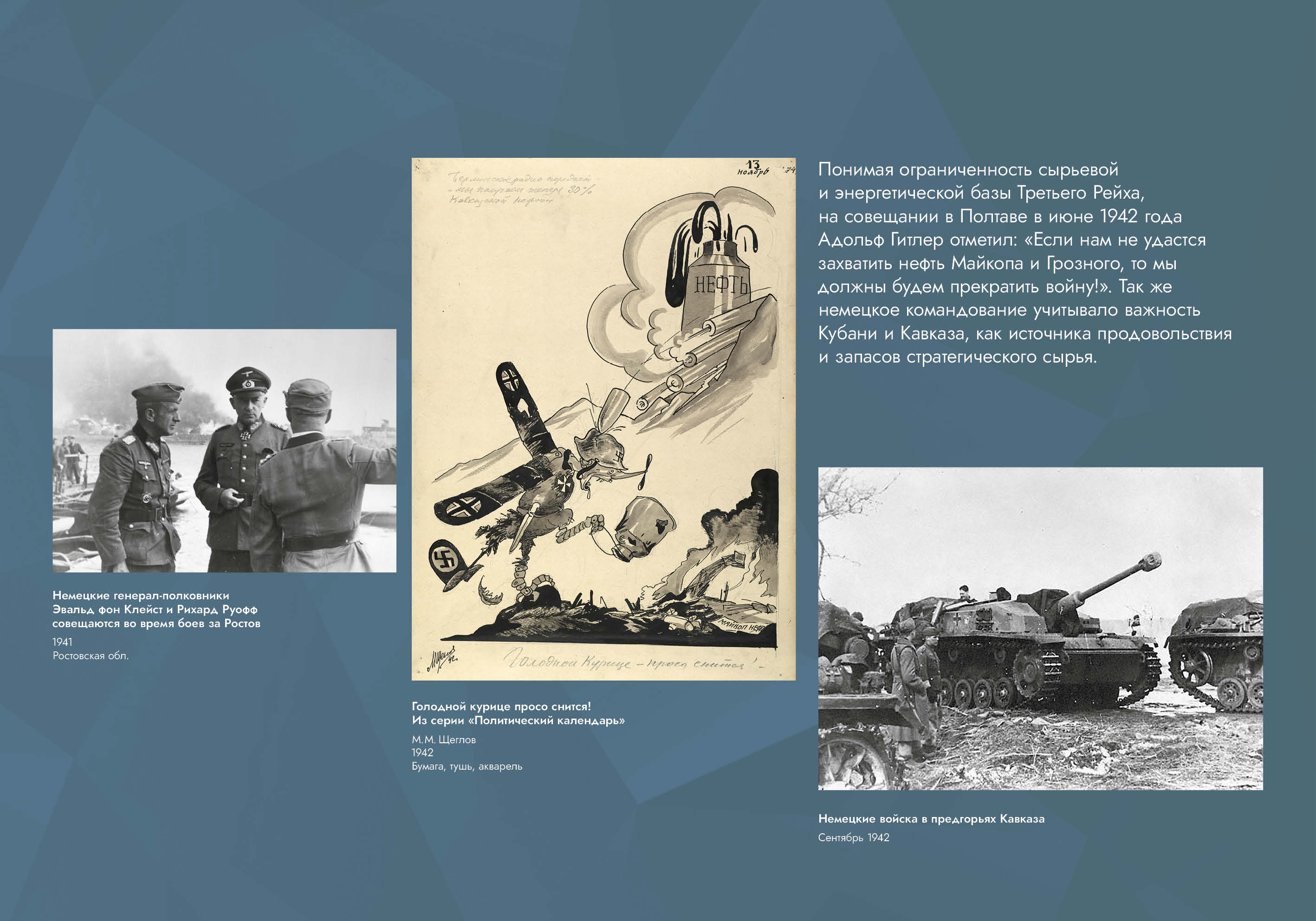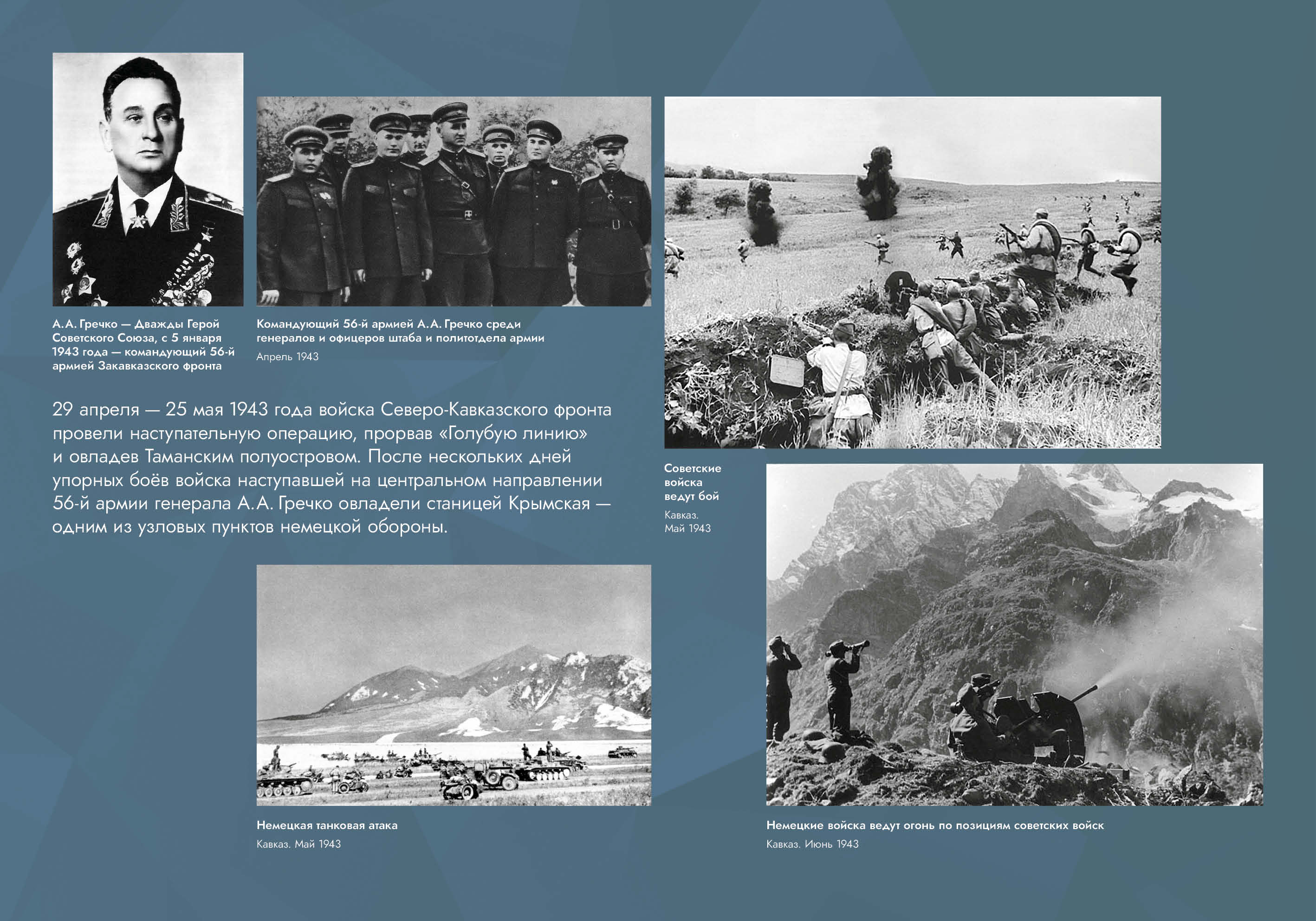 Выставка рассказывает об оборонительных и наступательных операциях, проведённых советскими войсками с целью обороны Кавказа и разгрома вторгшихся в его пределы немецко-фашистских войск.