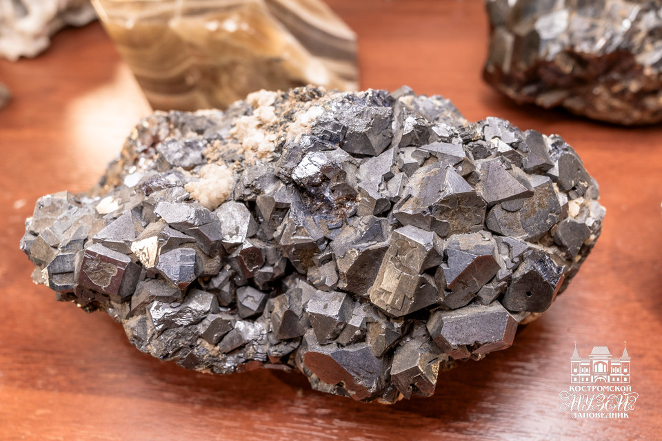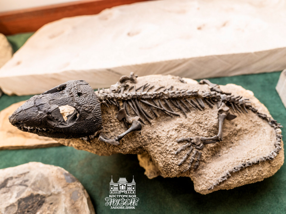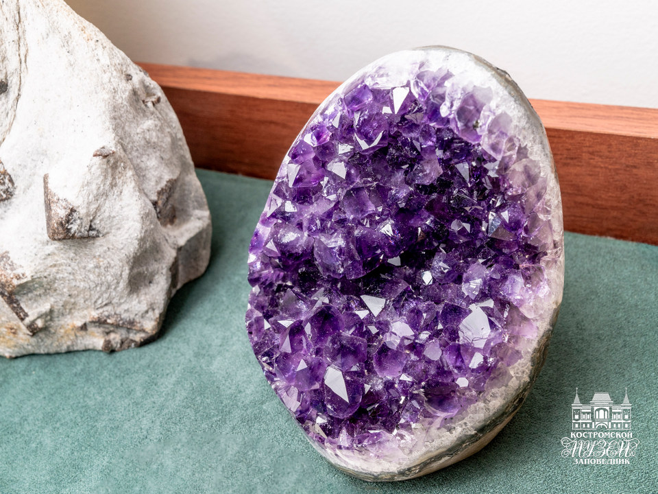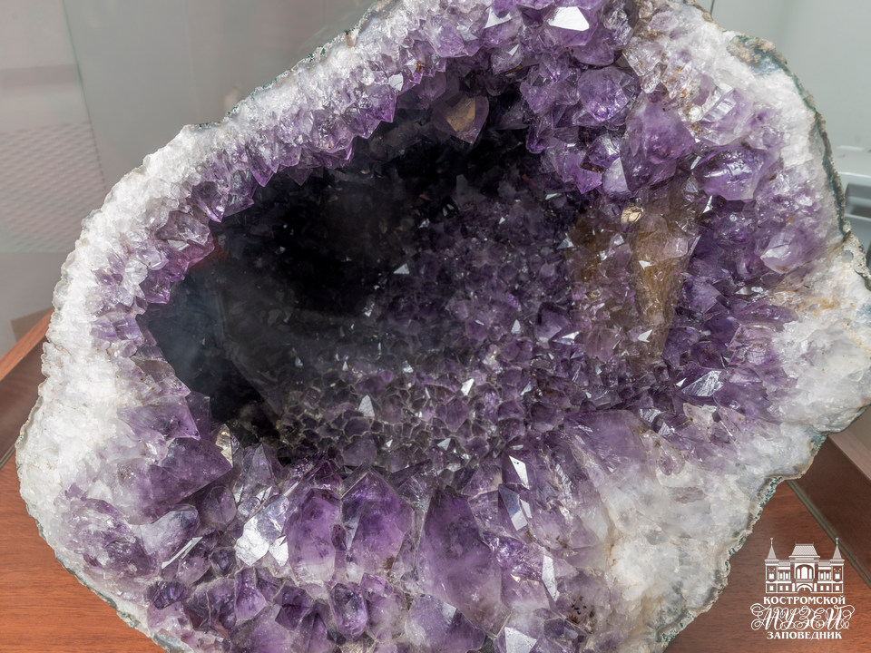 Выдающийся экземпляр — аметистовая жеода диаметром 30 см (Бразилия). - Палеонтология. Редчайшие образцы древних организмов в окаменелостях и слепках, иллюстрирующие основные этапы эволюции жизни на Земле. Среди них муляж Иностранцевии — ящера мелового периода, череп шерстистого носорога — представителя ледникового периода.