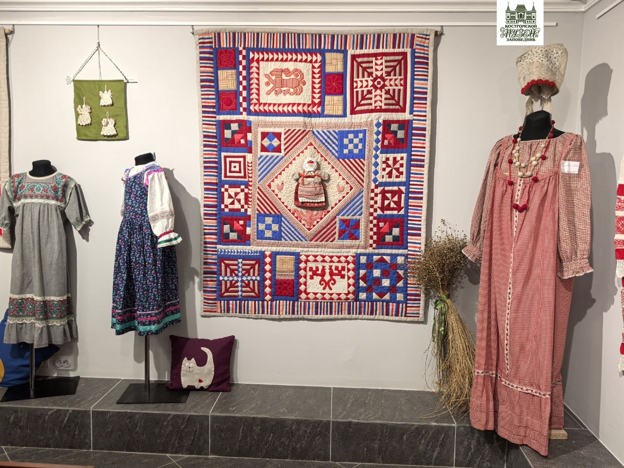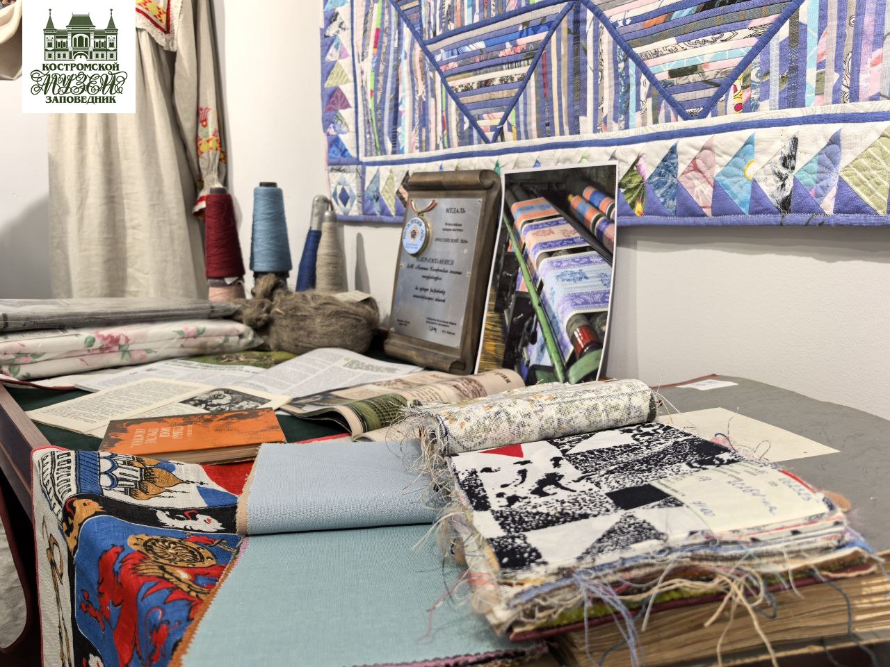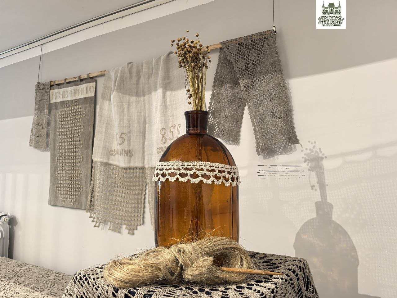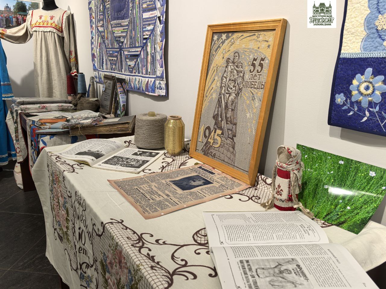 Экспозиция также знакомит с историей Большой костромской льняной мануфактуры, показывая образцы продукции разных лет, отражающие развитие льняной промышленности в регионе.