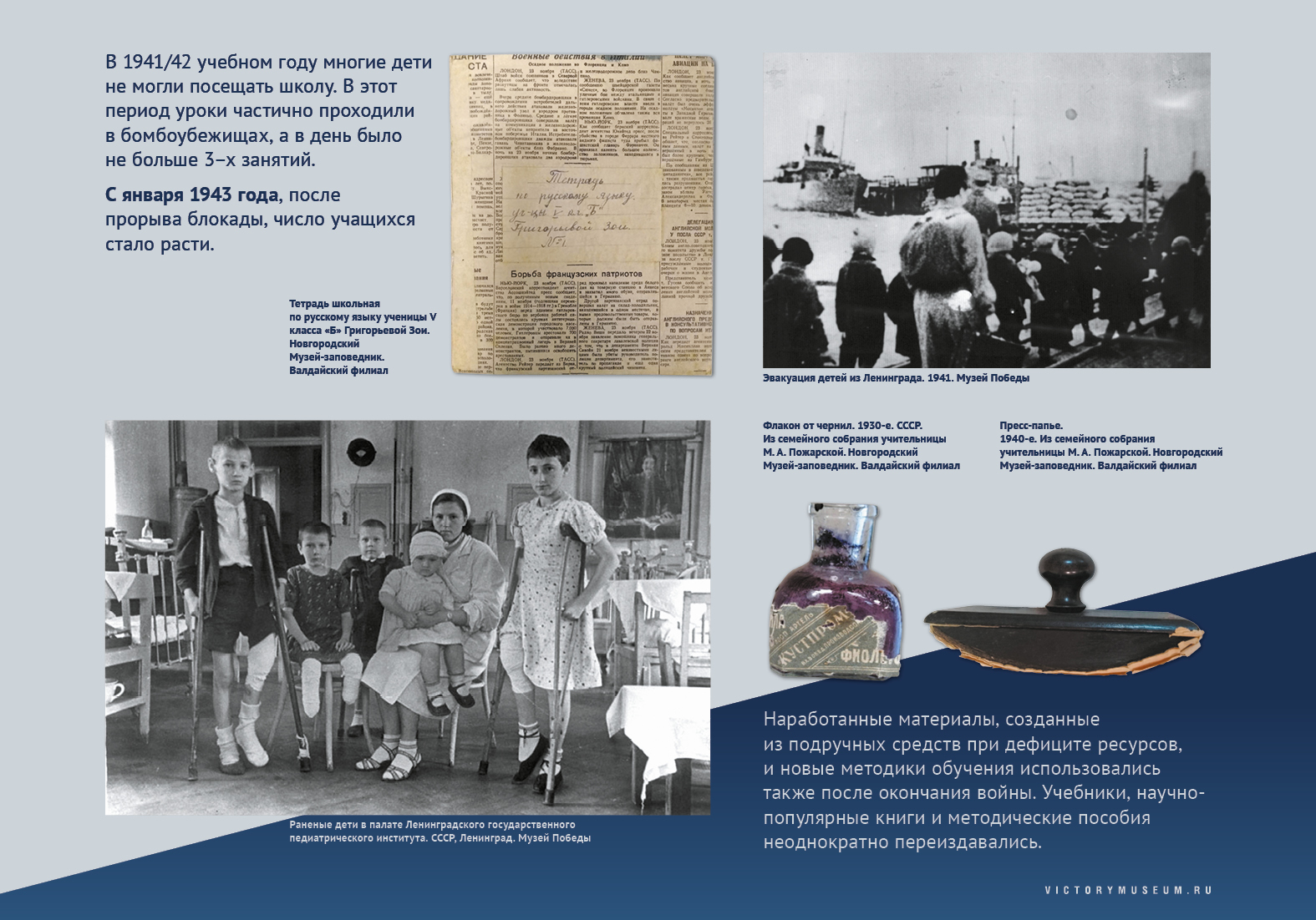 В зале представлены подлинные свидетели тех трагических и героических лет: фотографии, документы, письма, личные вещи, форменная одежда фронтовиков, тружеников тыла, детей войны.