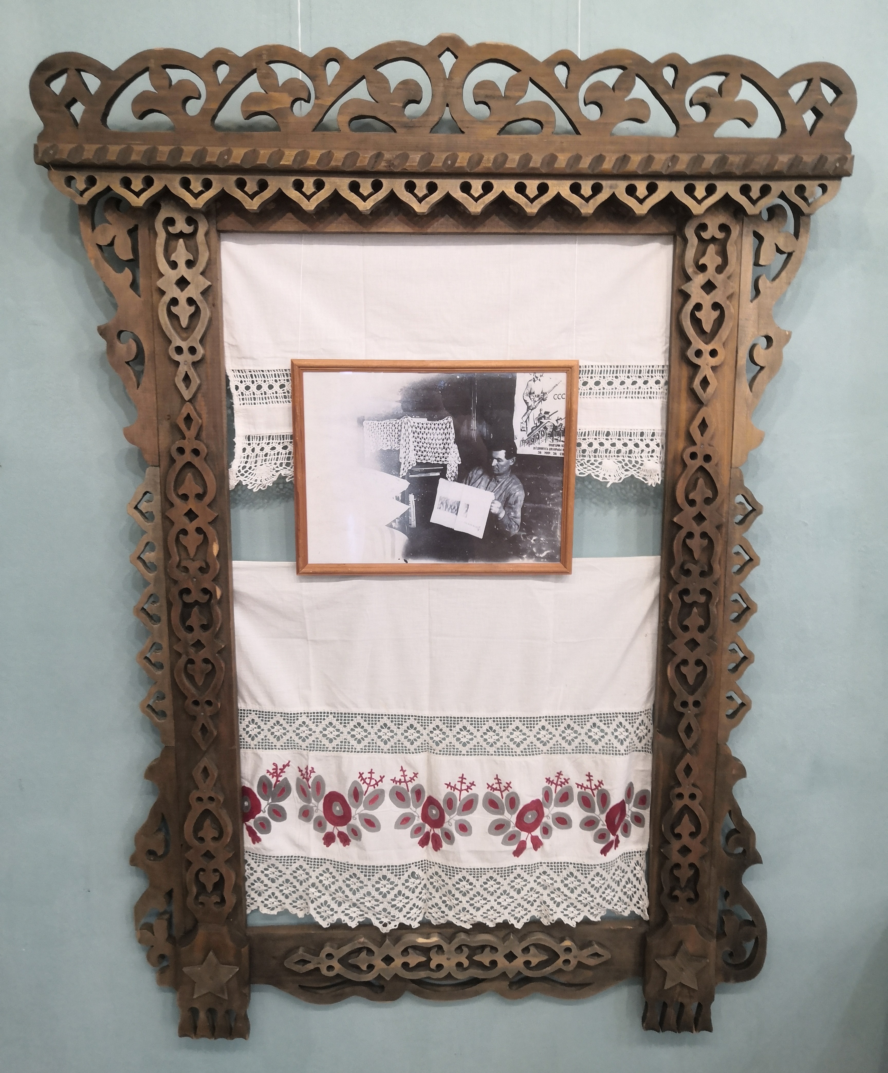 Фотографии оформлены в резные деревянные наличники, до сих пор являющиеся особым украшением городских домов — «деревянным кружевом Нерехты».