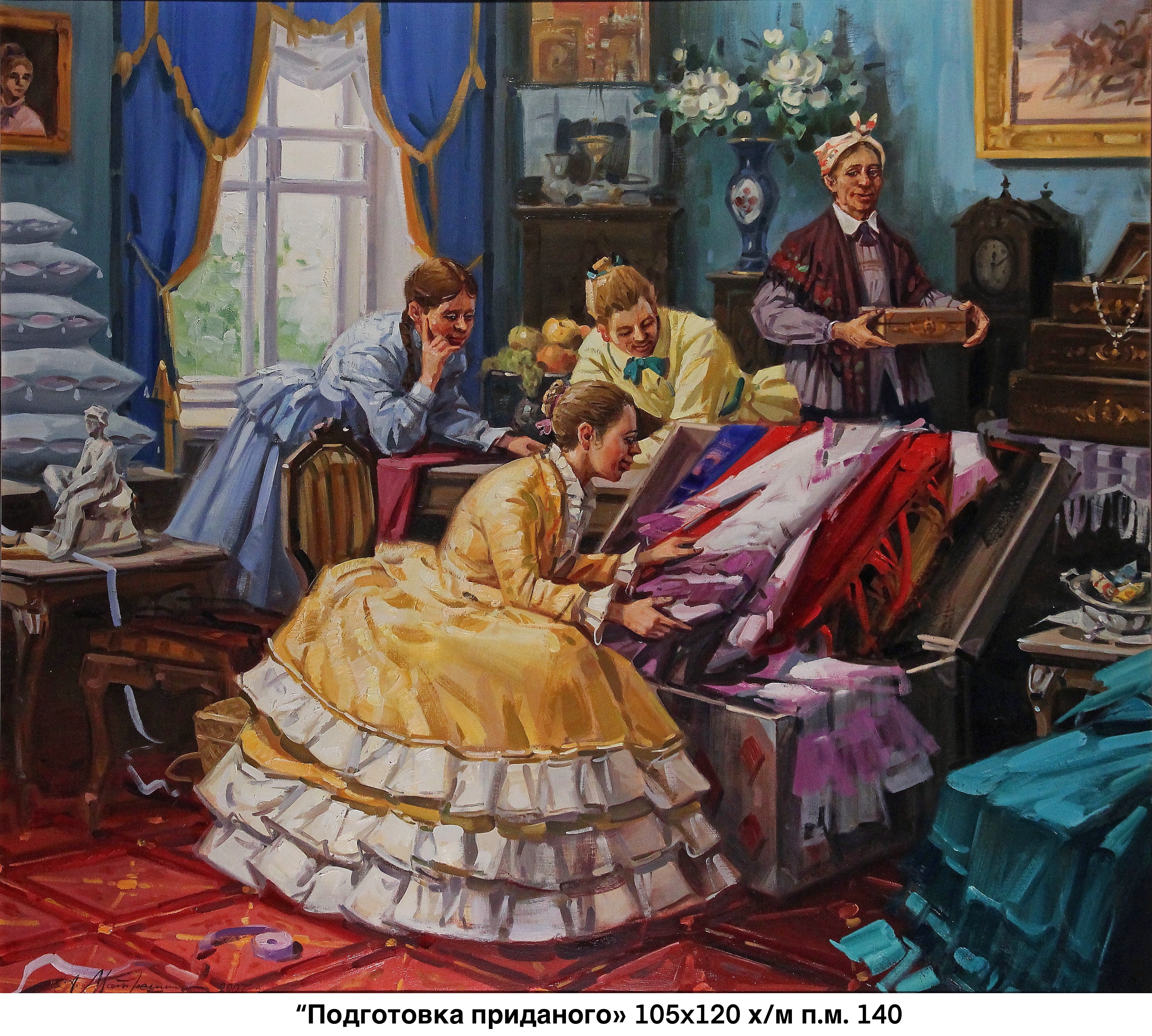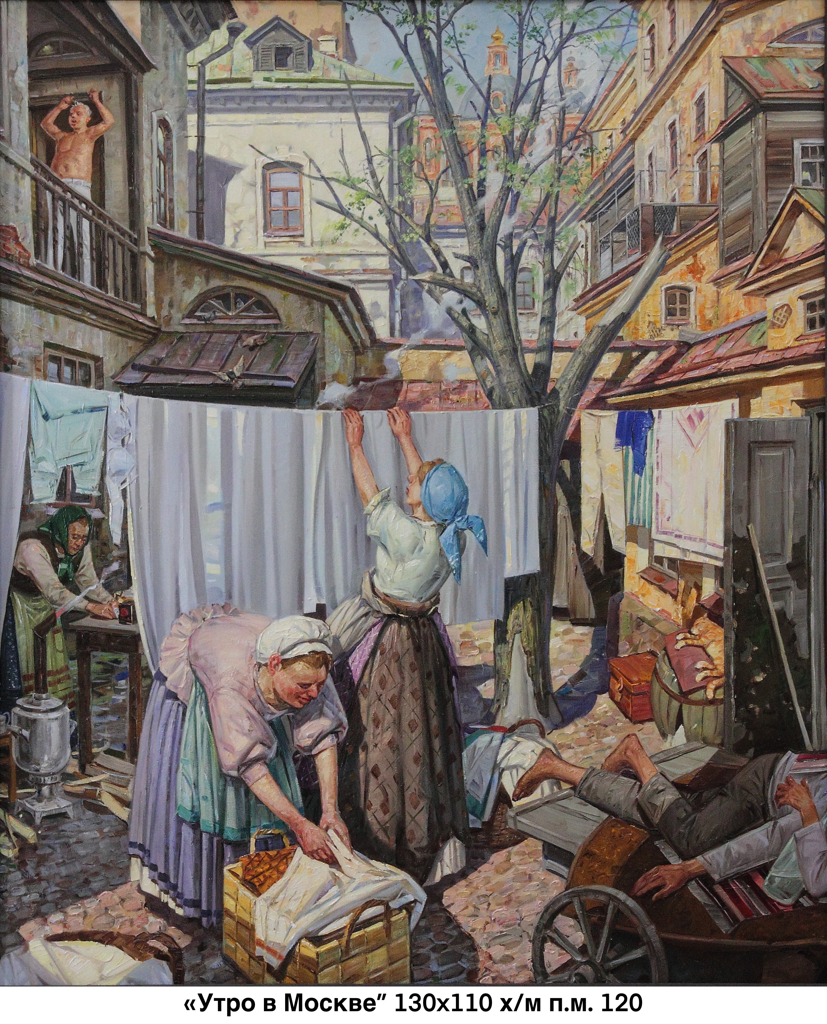 Выставка необычная: работы мастера яркие, колоритные, крупномасштабные и кинематографичные, с динамичным сюжетом — словно остановившийся кинокадр. А самый большой холст носит название «Кострома. День города». Двухметровое полотно совсем свежее: автор написал его в конце 2025 года.